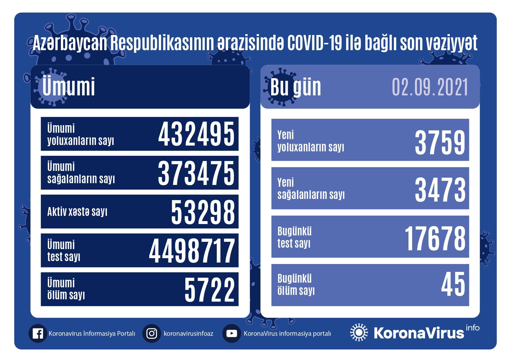 Azərbaycanda koronavirus (COVID-19) infeksiyasına 3759 yeni yoluxma faktı qeydə alınıb, 3473 nəfər müalicə olunaraq sağalıb.
