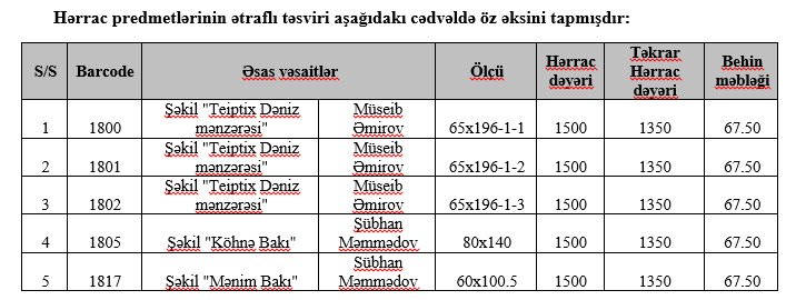 Təkrar hərracda iştirak üçün hər bir rəsm əsəri üzrə 67.50 (altmış yeddi man.50 qəp.) manat məbləğində behi, hərracın təyin edildiyi tarixə 1 (bir) iş günü qalanadək ödənilməlidir.