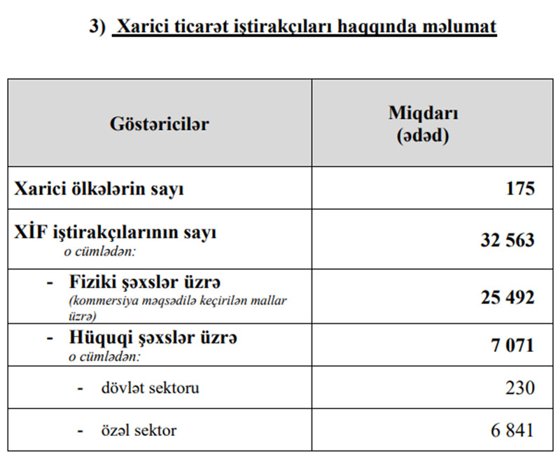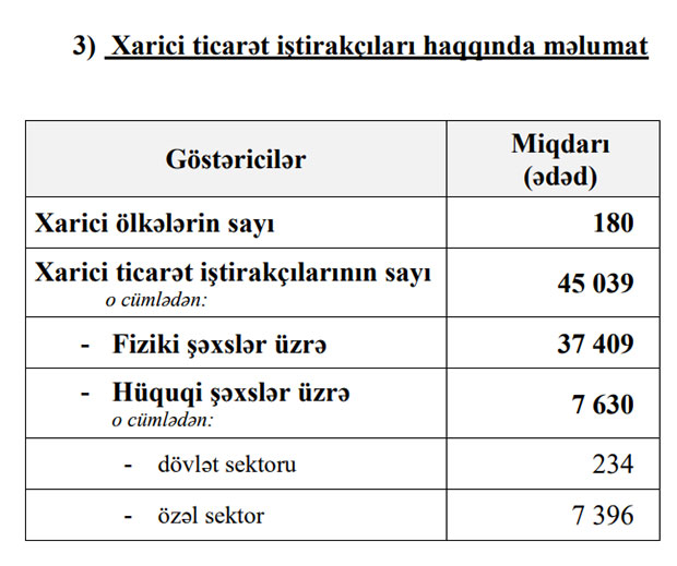 Qeyd edək ki, 2020-ci ilin 12 ayı ərzində xarici ticarət iştirakçılarının sayı 45 min 462, o cümlədən fiziki şəxslərin sayı 37 min 211, hüquqi şəxslərin sayı 8 min 251 olmuşdu.