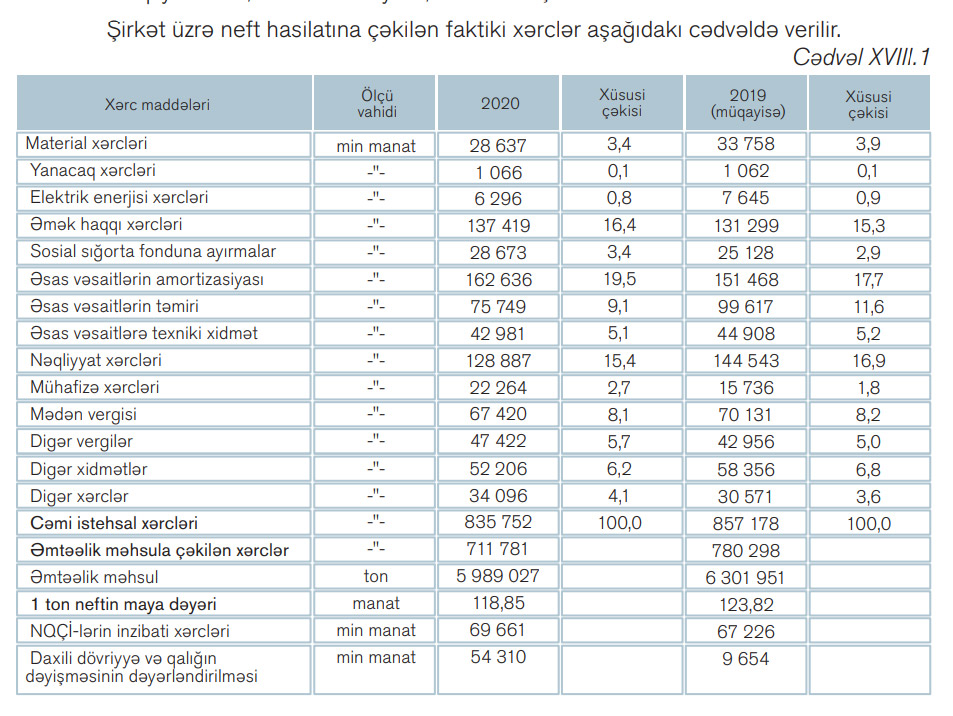 Hesabatda qeyd edilib ki, şirkət üzrə neftin və qazın maya dəyərləri azalmışdır. Neftin maya dəyərinin azalması keçən ilə nisbətən material xərclərinin, elektrik enerjisi xərclərinin, əsaslı təmir və texniki xidmət xərclərinin, nəqliyyat xərclərinin, mədən vergisi, digər xidmətlər üzrə xərclərin azalması hesabına baş vermişdir. Belə ki, material xərcləri 5 121 min manat (15,2%), elektrik enerjisi xərcləri 1 349 min manat (17,6%), əsaslı təmir və texniki xidmət xərcləri 25 795 min manat (17,8%), nəqliyyat xərcləri 15 656 min manat (10,8%), mədən vergisi 2 711 (3,9%), digər xidmətlər 6 150 min manat (10,5%) azalmışdır.