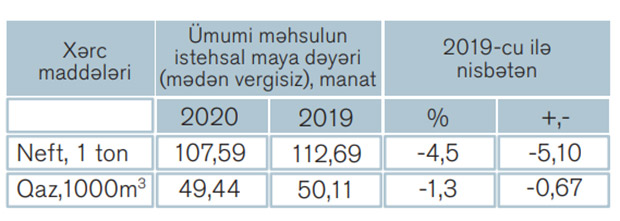 2020-ci ildə 1 ton neftin istehsal maya dəyəri 118,85 manat təşkil etmiş və keçən ilin müvafiq dövrü ilə müqayisədə 4,97 manat və ya 4,0 % azalmışdır. Bu, SOCAR-ın 2020-ci il üzrə İllik Hesabatında qeyd edilib.
