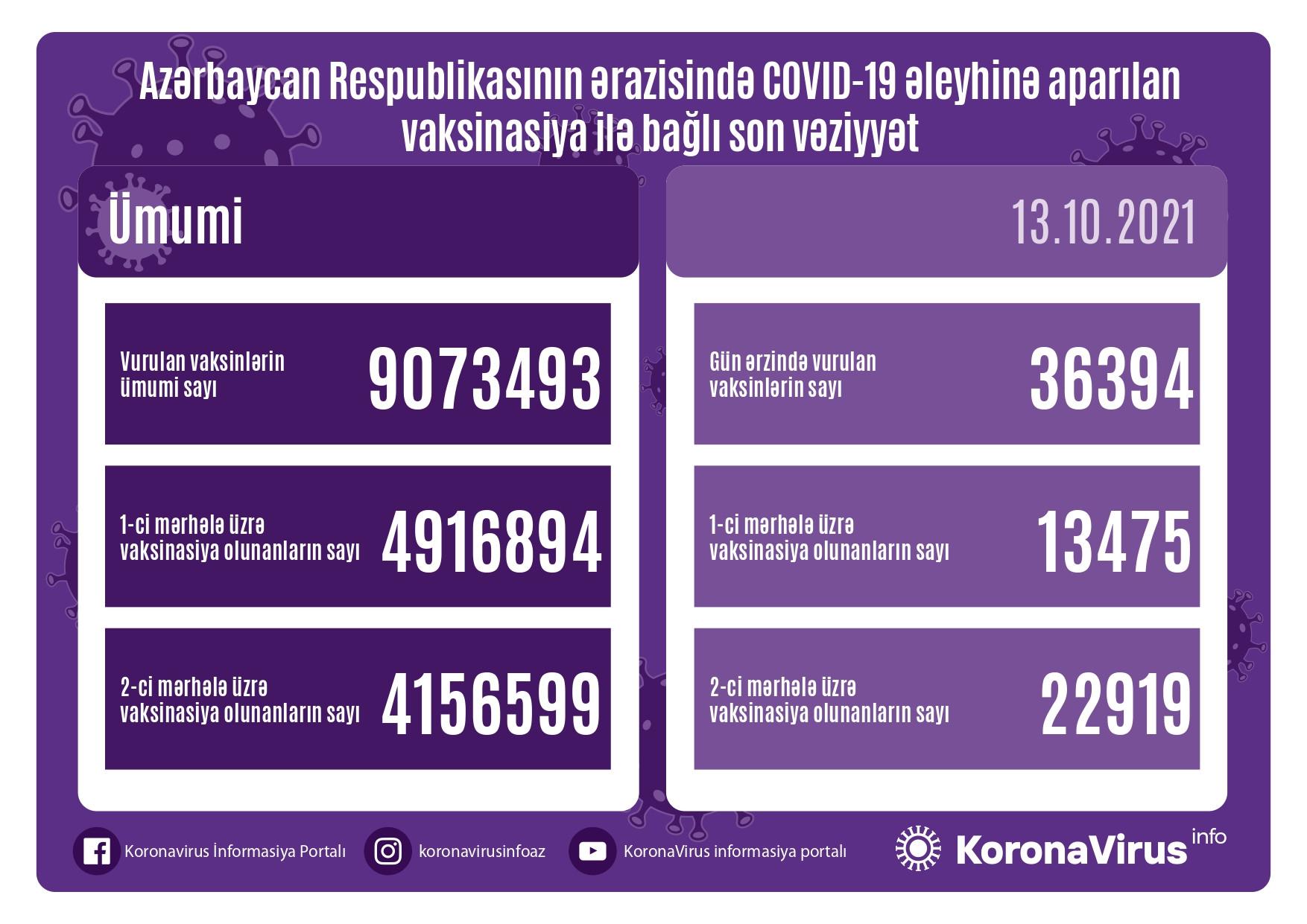 Azərbaycanda son sutkada koronavirus (COVID-19) əleyhinə 36 394 vaksin vurulub. Bir gündə birinci mərhələ üzrə vaksinasiya olunanların sayı 13 475, ikinci mərhələ üzrə vaksinasiya olunanların sayı 22 919 nəfərdir.