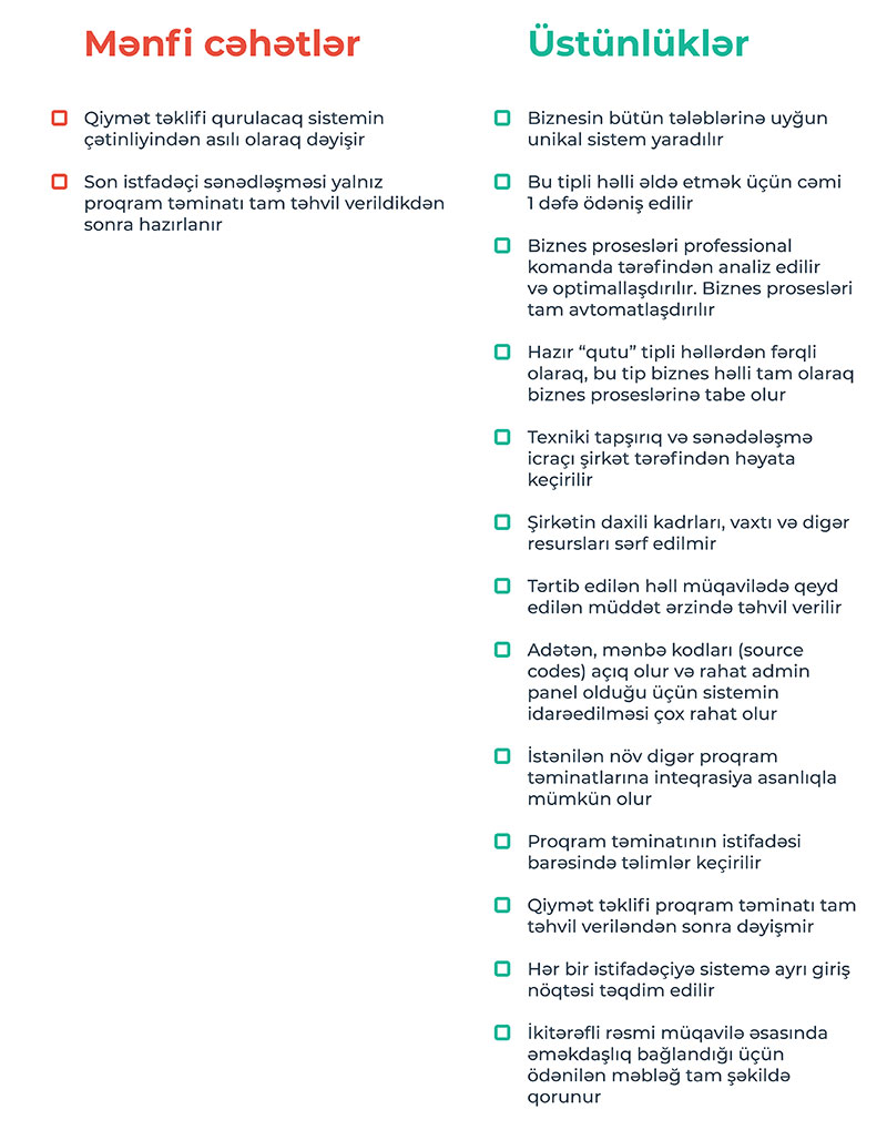 Hər 3 cədvəldən göründüyü kimi ən sərfəli və doğru seçim professional şirkətin tərtib etdiyi biznes həlləridir. Belə ki, şirkət rəhbərliyi biznesin idarə edilməsi həlli barədə seçimi və problemi birbaşa unudur, biznes prosesləri tam avtomatlaşdırılır və şirkət aylıq xərclərdən azad edilmiş olur.