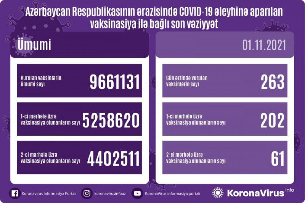 Azərbaycanda son sutkada koronavirus (COVID-19) əleyhinə 263 vaksin vurulub. Bir gündə birinci mərhələ üzrə vaksinasiya olunanların sayı 202, ikinci mərhələ üzrə vaksinasiya olunanların sayı 61 nəfərdir.