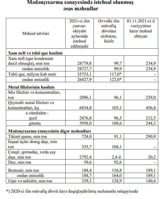 2021-ci ilin yanvar-oktyabr aylarında Azərbaycanın mədənçıxarma sənayesində istehsalın ümumi dəyəri 26,5 milyard manat olmaqla, əvvəlki ilin yanvar-oktyabr aylarına nisbətən 1,6 faiz artmışdır.