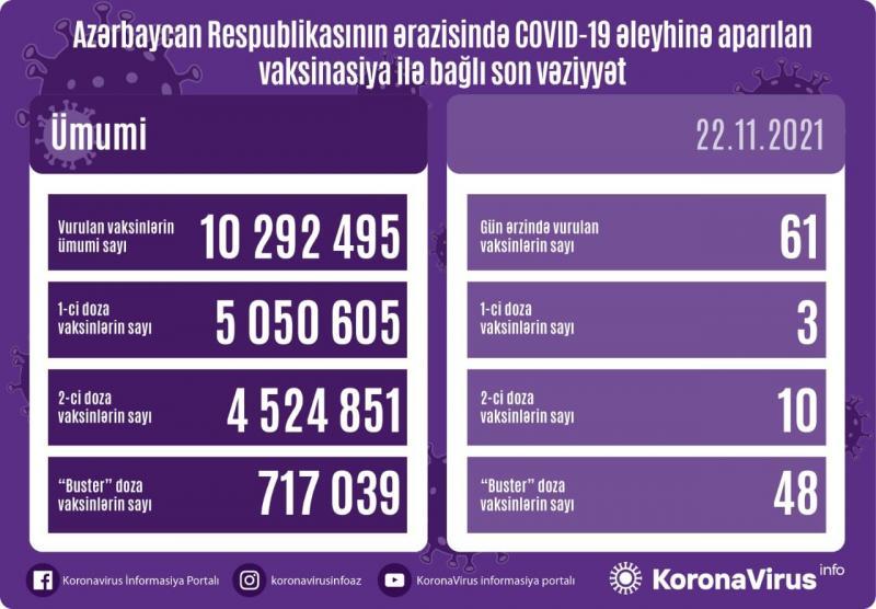 Ölkədə vurulan vaksinlərin ümumi sayı 10 292 495, birinci mərhələ üzrə vaksinasiya olunanların ümumi sayı 5 050 605, ikinci mərhələ üzrə vaksinasiya olunanların sayı 4 524 851, buster doza üzrə vaksinasiya olunanların sayı isə 717 039 təşkil edir.
