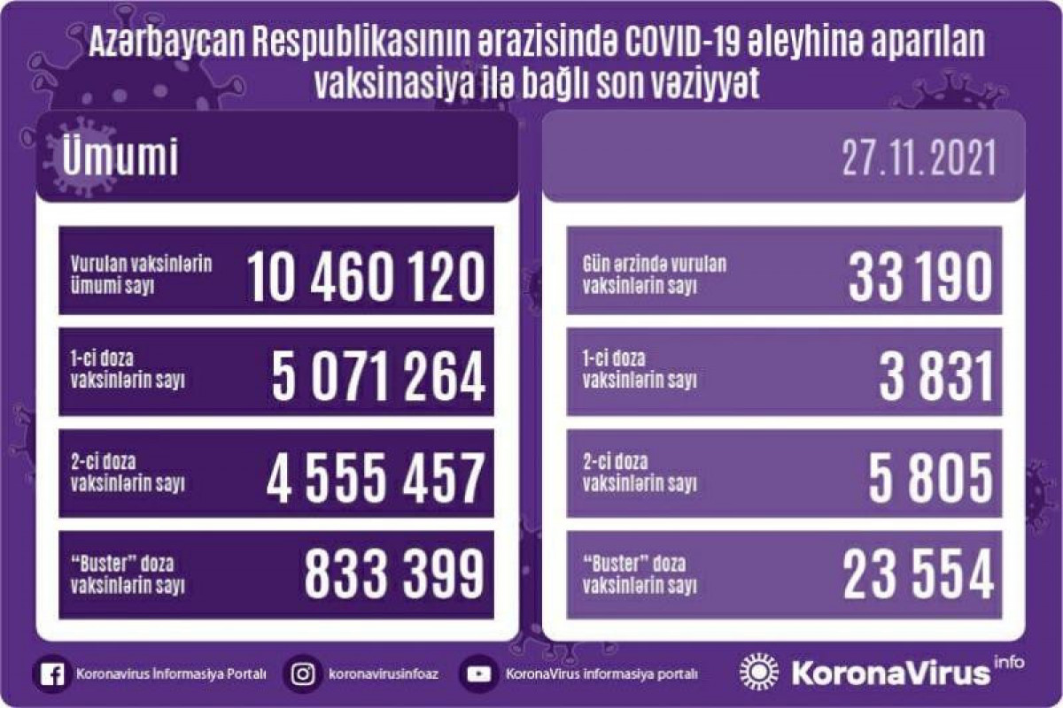 Nazirlər Kabineti yanında Operativ Qərargahdan verilən məlumata görə, bir gündə birinci mərhələ üzrə vaksinasiya olunanların sayı 3 831, ikinci mərhələ üzrə vaksinasiya olunanların sayı 5 805, buster doza üzrə vaksinasiya olunanların sayı isə 23 554 nəfərdir.