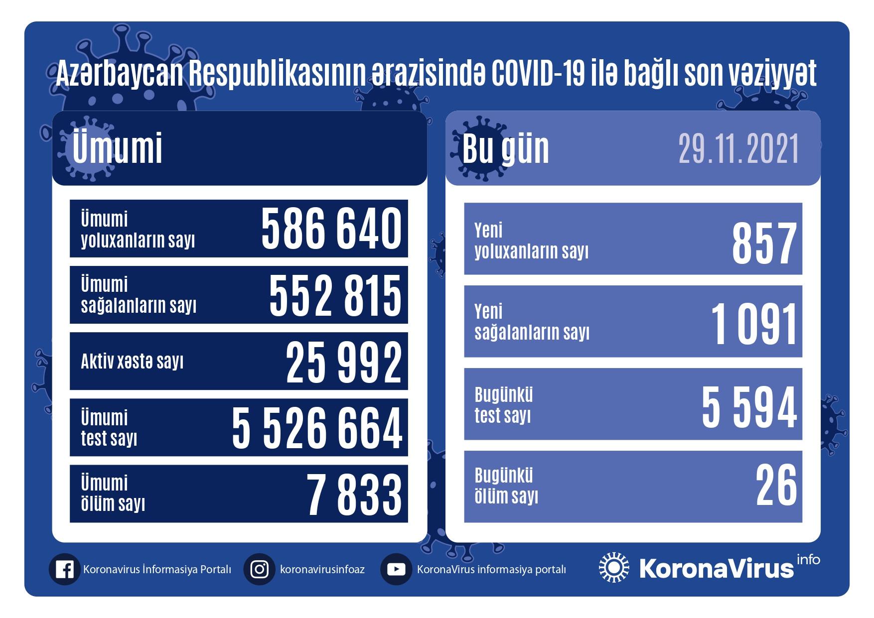 Nazirlər Kabineti yanında Operativ Qərargahdan verilən məlumata görə, analiz nümunələri müsbət çıxan 26 nəfər vəfat edib.