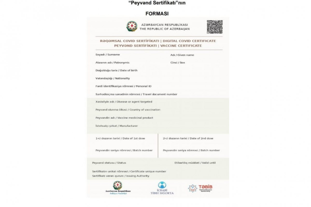 - COVID-19 xəstəliyinə qarşı peyvənd olunmanı təsdiqləyən Sertifikatda: