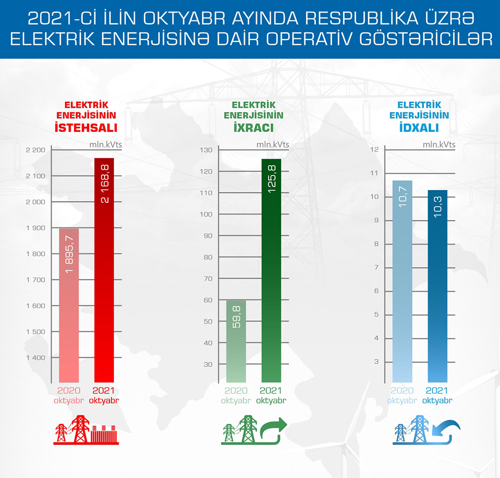 Energetika Nazirliyinin yaydığı məlumata görə, 2021-ci ilin yanvar-oktyabr ayları üzrə elektrik enerjisinə dair operativ məlumatlara əsasən, oktyabr ayında respublika üzrə elektrik enerjisinin istehsalı 2168,8 mln. kVt·st, ixracı 125,8 mln. kVt·st, idxalı 10,3 mln. kVt·st olub.