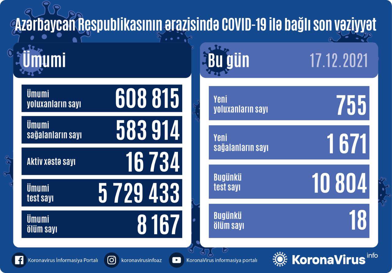 Azərbaycan Respublikasında koronavirus (COVID-19) infeksiyasına 755 yeni yoluxma faktı qeydə alınıb, 1671 nəfər müalicə olunaraq sağalıb.