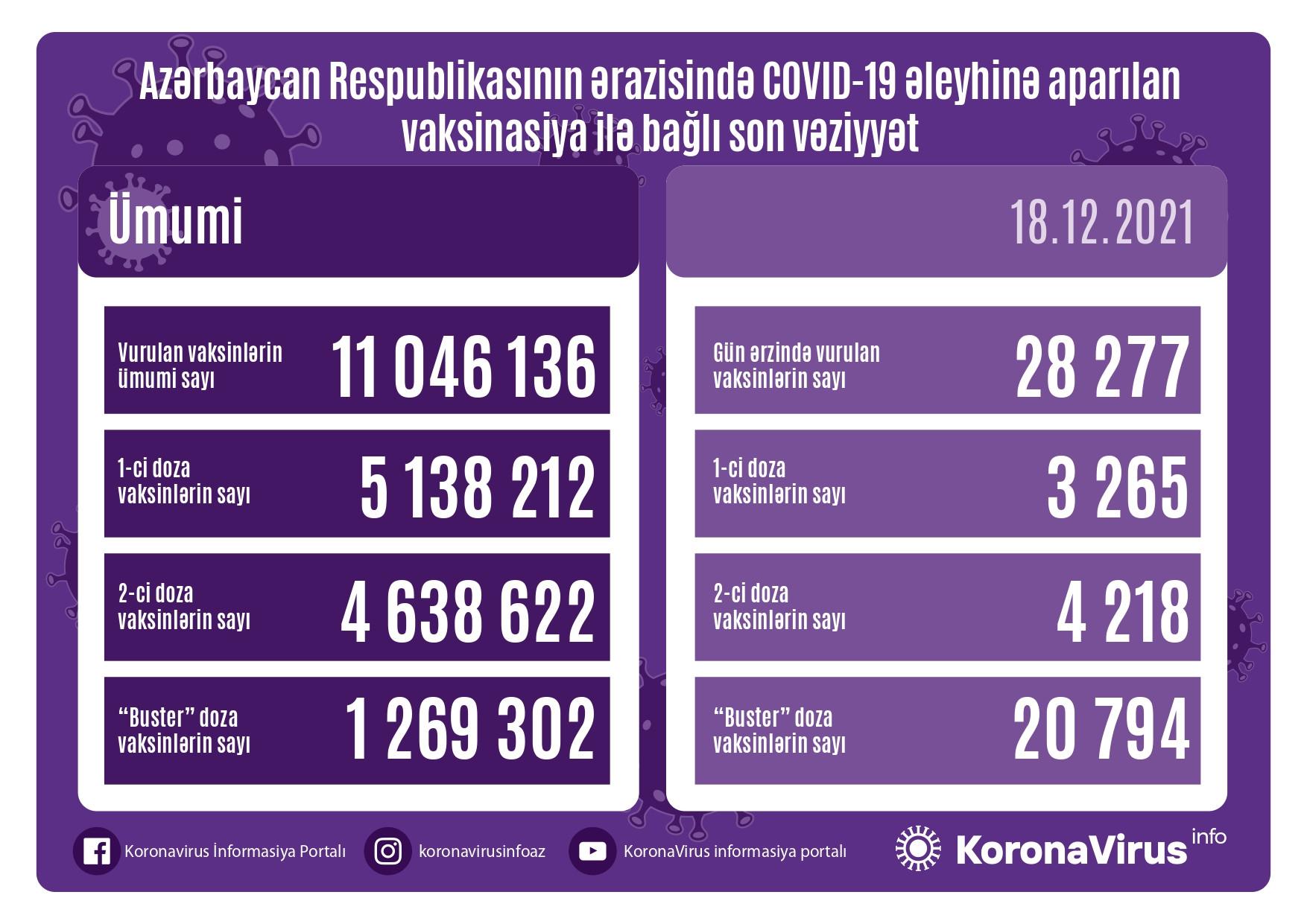 Azərbaycanda son sutkada koronavirus (COVID-19) əleyhinə 28277 vaksin vurulub. Bir gündə birinci mərhələ üzrə vaksinasiya olunanların sayı 3265, ikinci mərhələ üzrə vaksinasiya olunanların sayı 4218, buster doza üzrə vaksinasiya olunanların sayı isə 20794 nəfərdir.