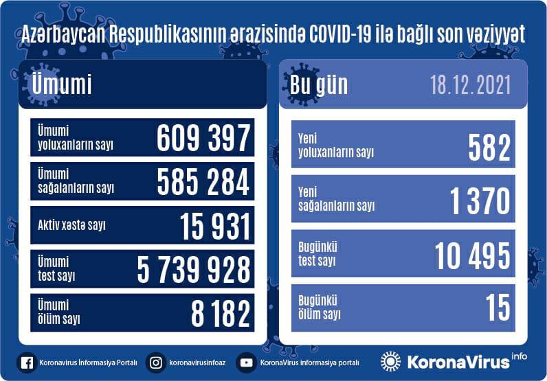 Azərbaycan Respublikasında koronavirus (COVID-19) infeksiyasına 582 yeni yoluxma faktı qeydə alınıb, 1370 nəfər müalicə olunaraq sağalıb.