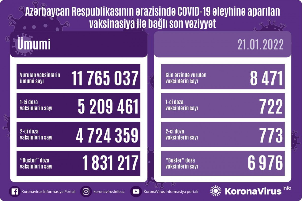 Azərbaycanda son sutkada koronavirus (COVID-19) əleyhinə 8 471 vaksin vurulub. Bir gündə birinci mərhələ üzrə vaksinasiya olunanların sayı 722, ikinci mərhələ üzrə vaksinasiya olunanların sayı 773, buster doza üzrə vaksinasiya olunanların sayı isə 6 976 nəfərdir.