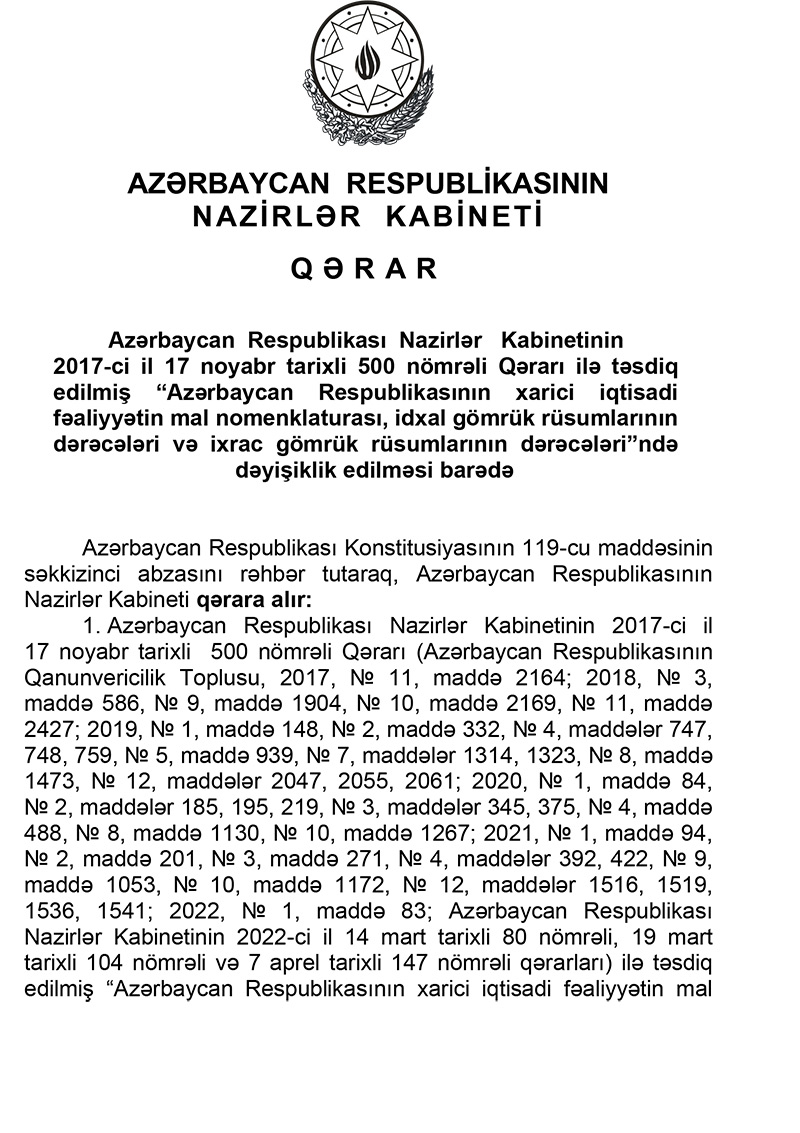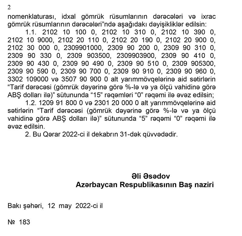 Baş nazir Əli Əsədov bununla bağlı “Azərbaycan Respublikasının xarici iqtisadi fəaliyyətin mal 2 nomenklaturası, idxal gömrük rüsumlarının dərəcələri və ixrac gömrük rüsumlarının dərəcələri”nə dəyişiklik edib.