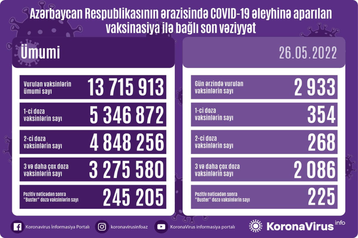 Azərbaycanda son sutkada koronavirus (COVID-19) əleyhinə 2933 vaksin vurulub. Bir gündə birinci mərhələ üzrə vaksinasiya olunanların sayı 354, ikinci mərhələ üzrə vaksinasiya olunanların sayı 268, 3-cü və daha çox doza üzrə vaksinasiya olunanların sayı 2086, pozitiv nəticədən sonra buster doza olunanların sayı isə 225 nəfərdir.