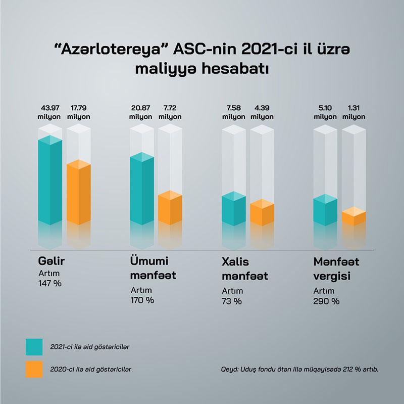 2021-ci ildə “Azərlotereya” ASC-nin satışdan gəlirləri ötən ilə nisbətən 147 faiz artaraq 43,9 milyon manat təşkil edib. Lotereya iştirakçıları üçün ayrılmış uduş fondunda da xeyli artım müşahidə olunub. Bu göstərici 2020-ci illə müqayisədə 212 faiz artıb.