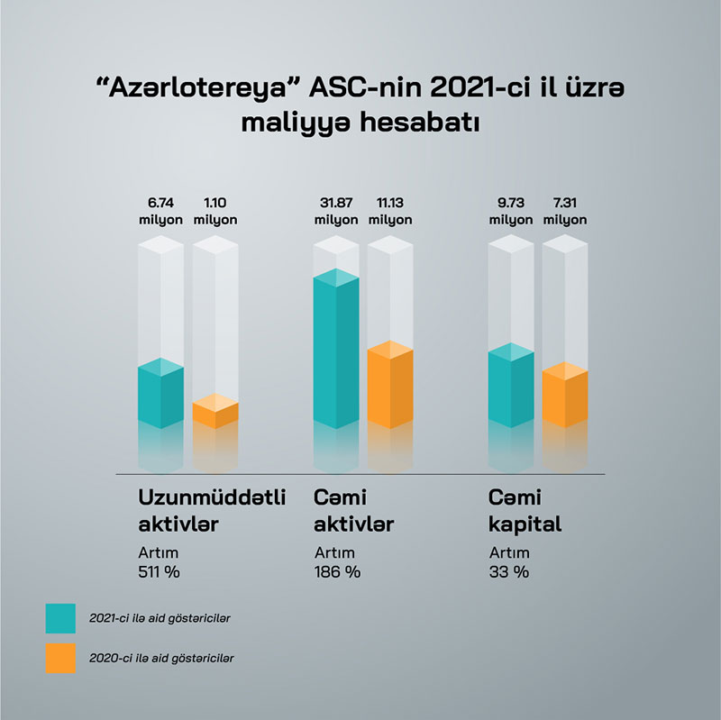 2021-ci il ərzində şirkət 5,6 milyon manat məbləğində investisiya edərək uzunmüddətli aktivlərini 1,1 milyon manatdan 6,7 milyon manata yüksəldib. O cümlədən, “Azərlotereya” ASC-nin 2021-ci ilin sonu cəmi aktivləri 31,8 milyon manat təşkil edib. Şirkətin 2020-ci ilin sonunda cəmi aktivləri 11,1 milyon manat olub.