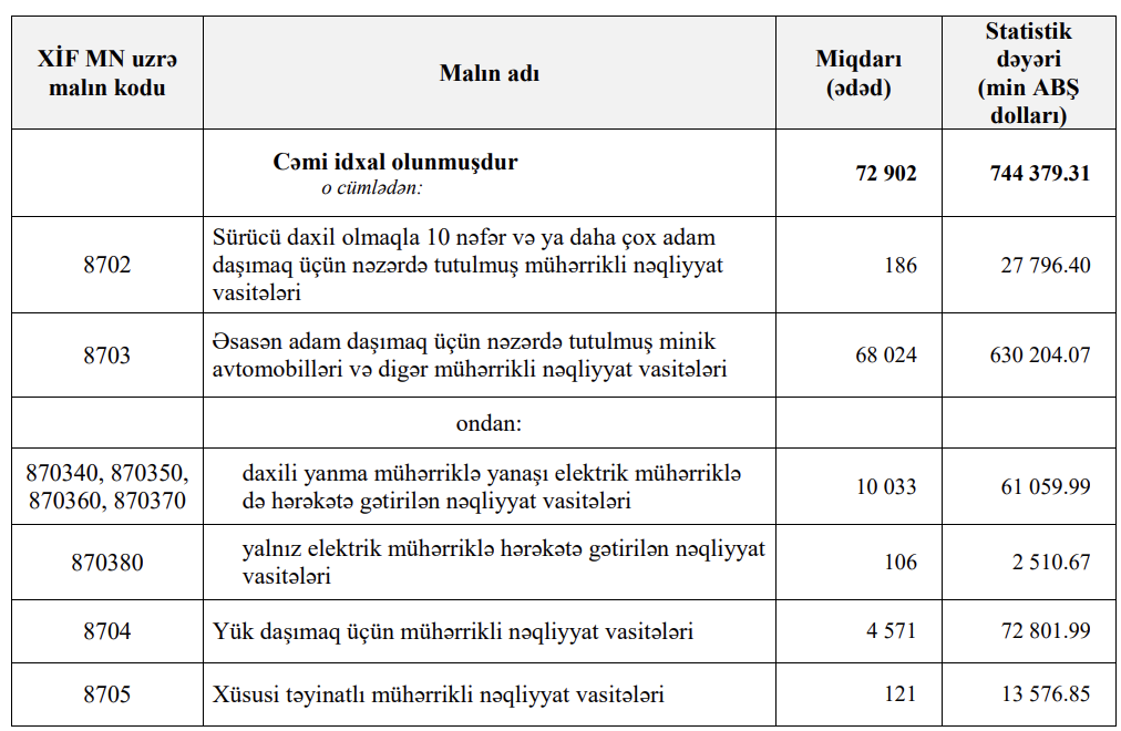 Minik avtomobillərinin idxalı ötən ilin 10 ayındakı 68 min 24 ədəddən 2022-ci ilin 10 ayında 56 min 92 ədədə düşüb.