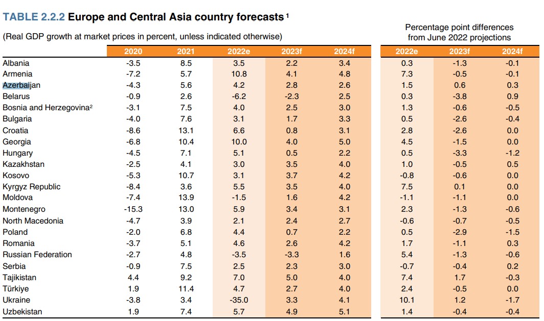 “2023-cü ildə Cənubi Qafqaz ölkələrinin ÜDM-in artımı 3,3%, 2022-ci ildə 6,5% artımdan sonra 2024-cü ildə - 3,5% təşkil edəcək. 2023-cü ildə region üzrə artım templərinin azalması 2021-2022-ci illərdə Ermənistanla Azərbaycan arasında sərhəddə mövcud gərginlik və Rusiyaya tədarükün azalması ilə əlaqədardır”, - DB qeyd edir.