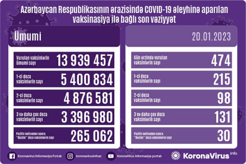 Azərbaycanda son sutkada koronavirus (COVID-19) əleyhinə 474 vaksin vurulub. Bir gündə birinci mərhələ üzrə vaksinasiya olunanların sayı 215, ikinci mərhələ üzrə vaksinasiya olunanların sayı 98, 3 və daha çox doza üzrə vaksinasiya olunanların sayı 131, pozitiv nəticədən sonra buster doza vaksin olunanların sayı isə 30-dur.