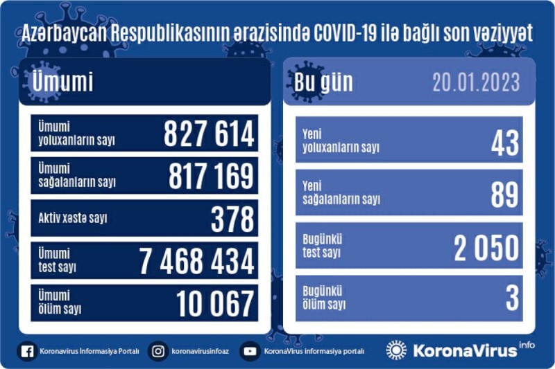 Azərbaycan Respublikasında koronavirus (COVID-19) infeksiyasına 43 yeni yoluxma faktı qeydə alınıb, 89 nəfər müalicə olunaraq sağalıb.
