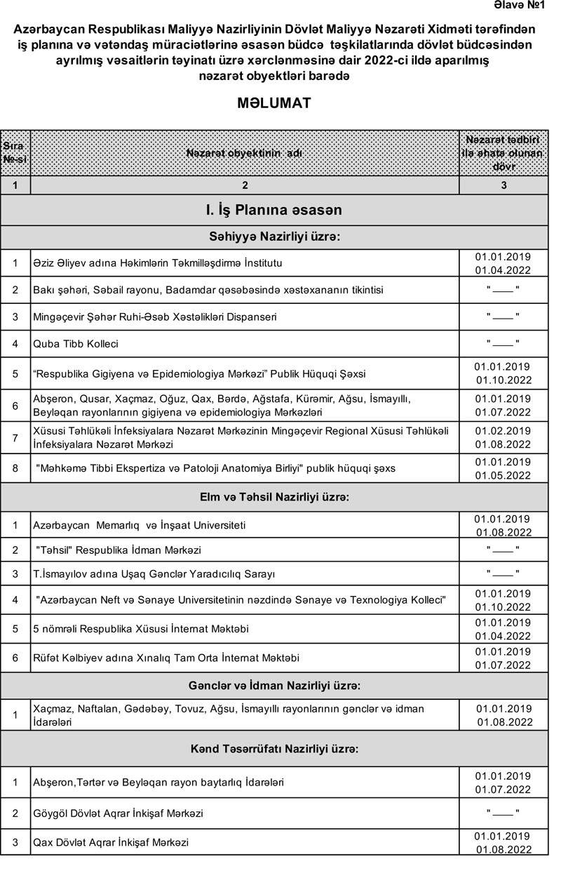 Maliyyə Nazirliyinin Dövlət Maliyyə Nəzarəti Xidməti tərəfindən 2022-ci ildə aparılmış nəzarət tədbirlərinin nəticələri haqqında məlumatlar açıqlanıb.